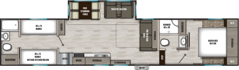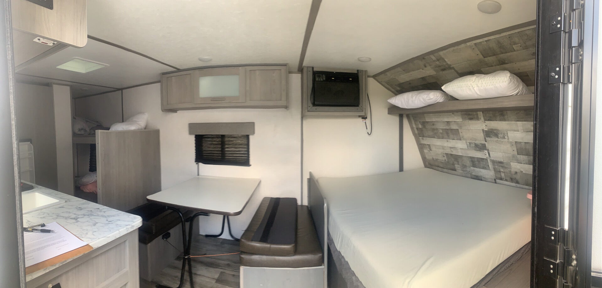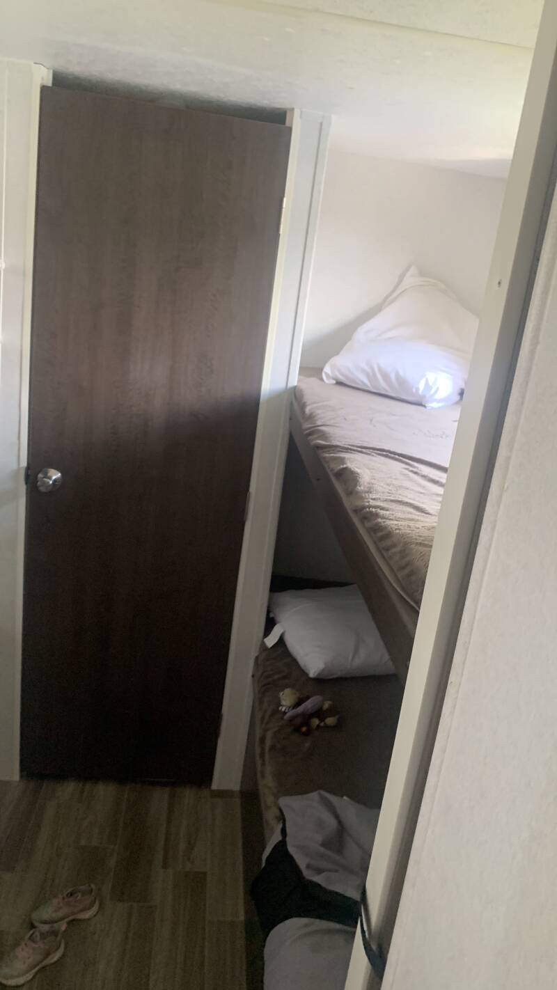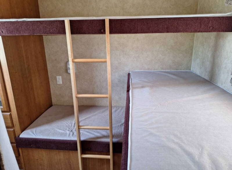 This unit can sleep up to 10 people. Full House offers a private master bedroom and a quad bunk room with sliding pocket door. The futon couch easily folds out to create another sleeping space. Need a place to hook up a Grill? We have that too, with 40lbs of propane and a 10 ft hose, you can set up your grill directly to the RV. No need to bring that heavy grill tank. Keep your food cold while traveling down the road with its 12 volt (batt.) powered fridge and freezer. Full House is a perfect camper for those long trips to your destination. Most of the amenities of Full House are powered from the battery. You can operate the slide, awning, water pump, heat, lights, water heater, fridge, and exterior awning lights without plugging in to shore power. Some items need shore power to operate like, A/C, microwave, outlets, and tv's. Full House comes with two TV's and DVD player. Perfect for families! This trailer weighs in at almost 7,500 lbs. with a hitch weight of 1,000 lbs. Check your vehicles tow ratings.