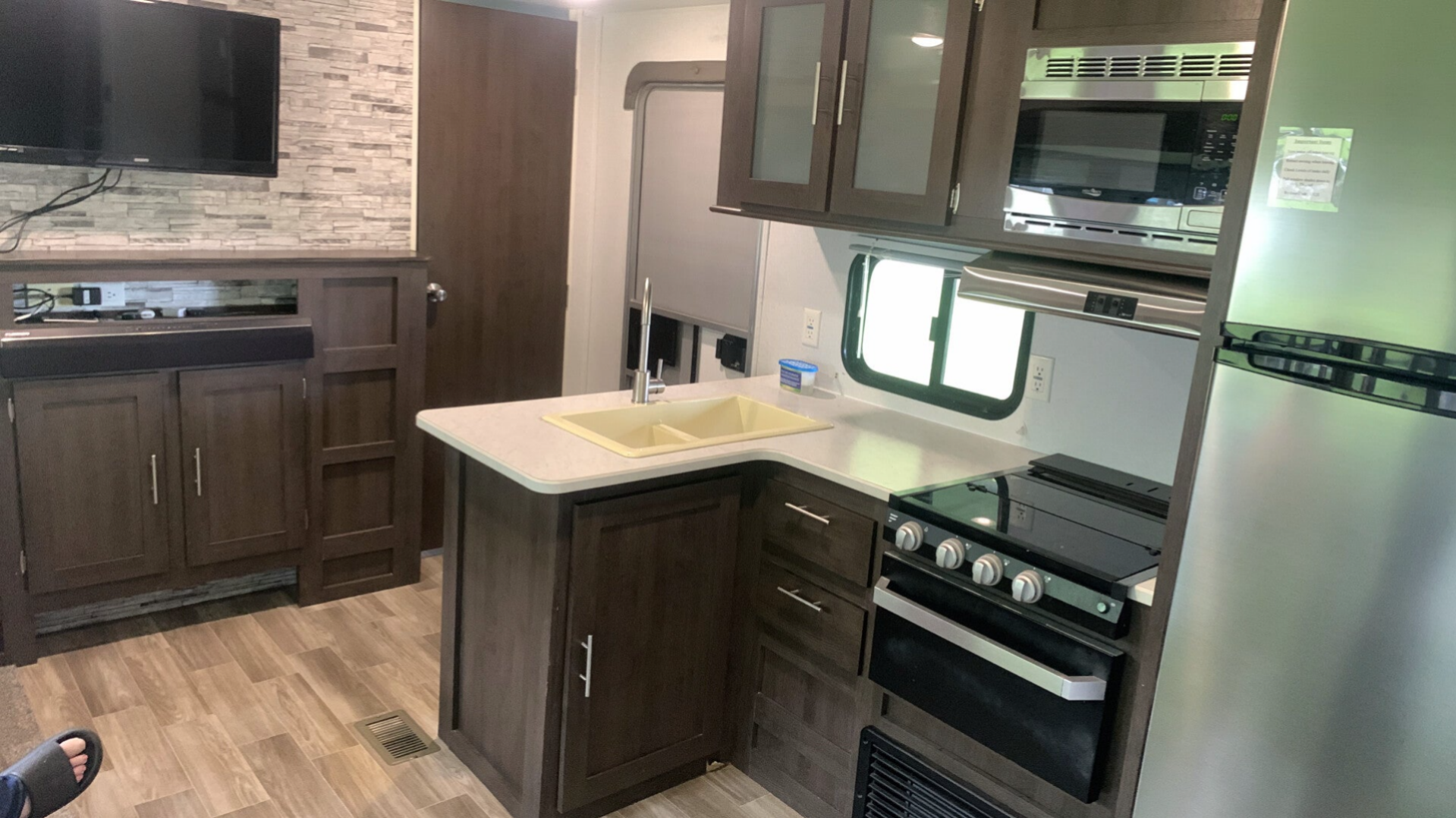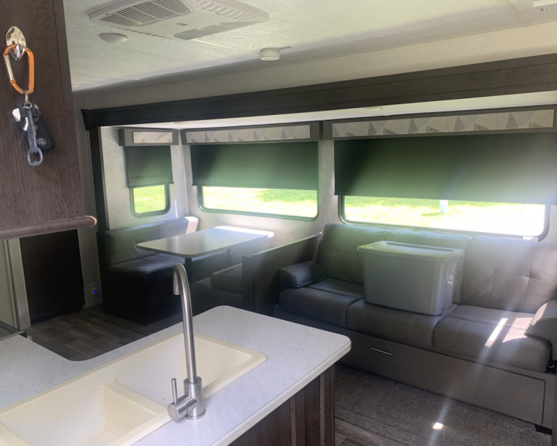 This beautiful unit is the ultimate in Glamping. The "Big" Rig can sleep up to 7. From nose to tail, 42 ft long, the "Big" Rig is our family's favorite. The lay out is amazing with a master bedroom in the nose followed by a full bath with walk in shower. Then down the steps to the main salon where a pull-out couch awaits, twin sofa recliners and a dinette for four. Across is the Kichen with a 3 burner cook top and oven. YES, an OVEN. Along with the farm style sink and large fridge and freezer. Can't forget about the Entertainment canter with 54" smart TV and sound system that allows you to play anything inside and out. Moving to the rear of this beast is a private bunk room with 3 beds and another smart TV. Thats not all, through the bunk room is another full bathroom with a tub shower combo and closet. So, the kids have their own bathroom and so do the adults. Each section of this "Big" Rig has its own A/C so you can stay cool all summer long. Worried about running out of hot water, not here, this trailer has an instant tankless hot water heater. large capacity storage tanks mean the whole family can take showers without having to worry about over filling the storage tanks. We cannot forget about the outdoor kitchen with its own sink, grill hook up, and mini fridge for the drinks. The "Big" Rig weighs in at around 9,800 lbs. with a pin weight of about 1,200 lbs. Light enough to be towed by a 2500 and shorter height than most fifth wheels. Standing at only 12' 2", this "Big" Rig can get into some tighter places that other taller fifth wheels can't. With its enclosed belly and tank heaters, the "Big" Rig can stay out camping all the way to temperatures reaching 0.