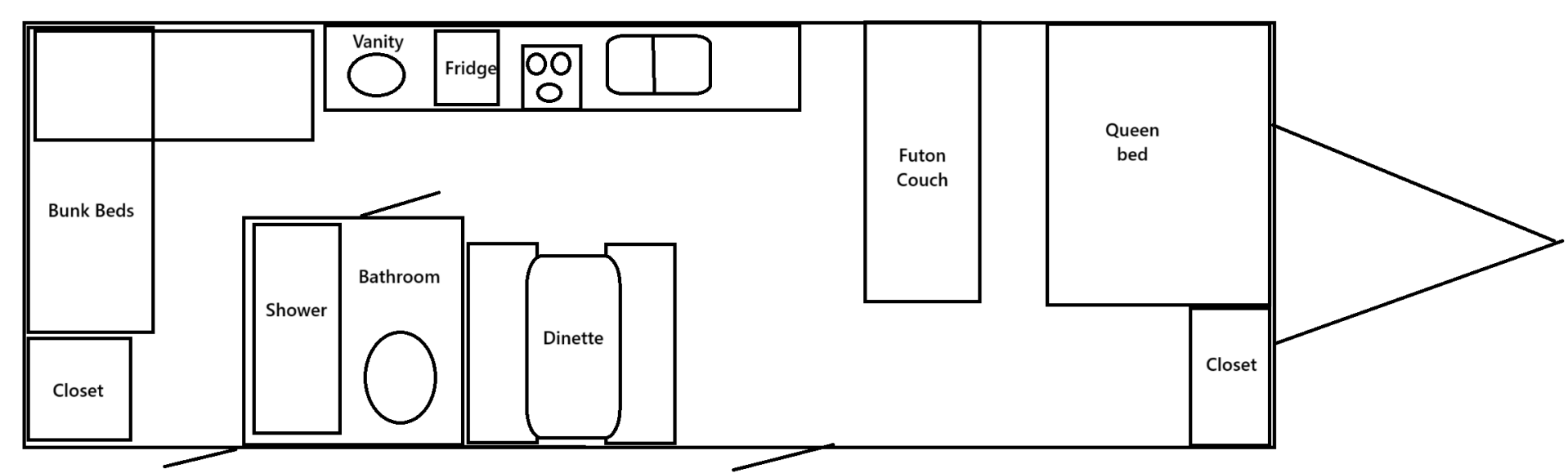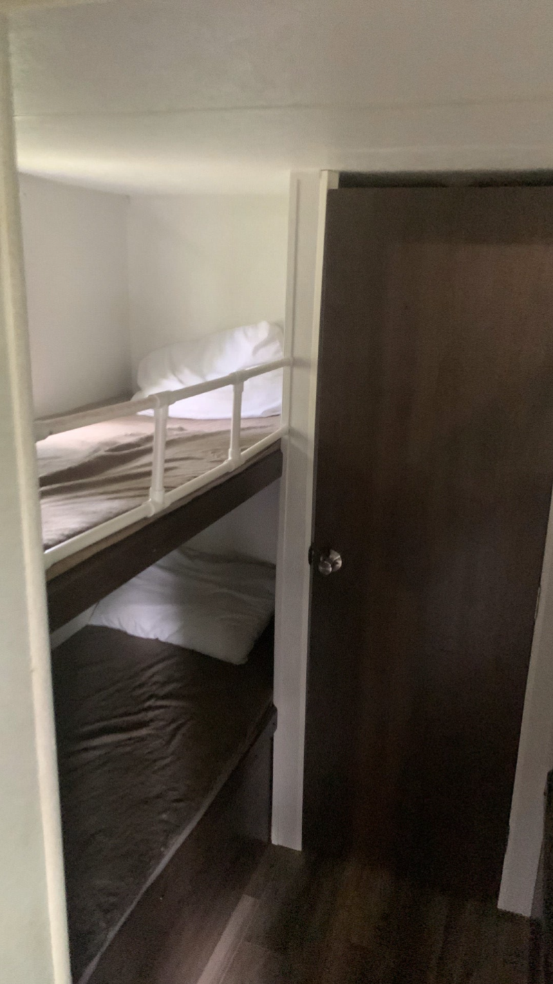 Hands down the best bang for your buck! This unit can sleep up to 8 with its futon couch and dinette that can transform into another sleeping space. The Wild Child also comes with our BFN amenities package, so you know that your prepared to go camping. Like our Big Rig, the Wild Child also has a stove with oven. Setting up this camper is a breeze as there are no slide outs, simply park, level, and you're done! The Wild Child does have a 16' awning to keep your campsite cool on those hot days. The fridge and freezer can be run on shore power or propane keeping your food items cold while you travel. Yes, this unit does have A/C. The Wild Child has dual entrances, the first enters the main seating area and the second to the bunk room. Did I forget to mention the sound system, the Wild Child has a built-in surround sound system inside and speakers outside for its AM/FM radio and CD player. The Wild Child was built for storage, so if you're thinking of taking a long vacation look no further. So, Get the family out of the house and go camping with The Wild Child. Tow weight: 7,500LBS, Hitch weight: 750lbs, Weight distribution hitch available!